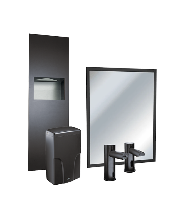 Our exclusive Matte Black Inter-Lok Angle Frame Mirror, EZ Fill™ Soap Dispensing System, Turbo-Pro™ Hand Dryer, and Piatto™ Collection of washroom accessories featured in matte black.